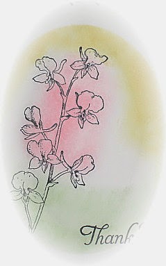 It card was so easy and fun to do. Our theme for May (in our 'crazy card club') was to make a thank you card ... no other criteria involved. I really enjoyed one of the cards we made at Pam's SAS in March using daubers to create a scene. I thought I'd give this a shot. I made a template using one of the large ovals and placed it over the center of my card. Actually, first I ran it through the big shot with the tulip border embossing folder. Then, keeping the template in place, I used the daubers to create this pastel background for my floral.